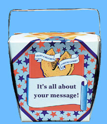 crispy fortune cookie! We'll print your message, logo or prize on a