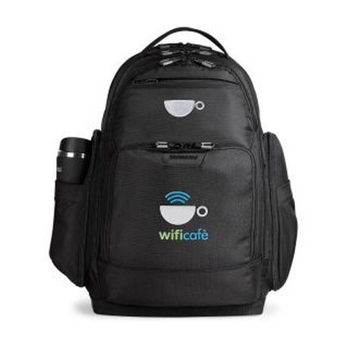 The perfect computer backpack for the everyday telecommuter. Zippered main compartment with articulating SmartShelf feature that keeps important items in view and organized when working remotely. Store items discretely behind the articulating shelf divider. Interior mesh headphone storage pocket. Front zippered pocket with multi-function organizer, RFID zippered pockets that prevent unauthorized access to personal information, and an adjustable hook and loop cord management solution. Side zippered compartments with multiple pockets for organization and a keychain clip. Side slash water bottle pockets. Scratch-resistant top pocket ideal for storing a smartphone. Rear zippered laptop pocket (fits up to a 17 laptop) and a scratch-resistant tablet pocket (fits up to a 12 tablet). Reinforced, flat bottom keeps bag upright when not being worn. Sport-mesh padded back panels for cool and dry comfort. Padded and adjustable shoulder straps with integrated thumb holes for easy adjustment. Sternum straps adjust horizontally and vertically for optimal carrying comfort. SmartSleeve slides over upright handles for easy mobility. Patent Pending.