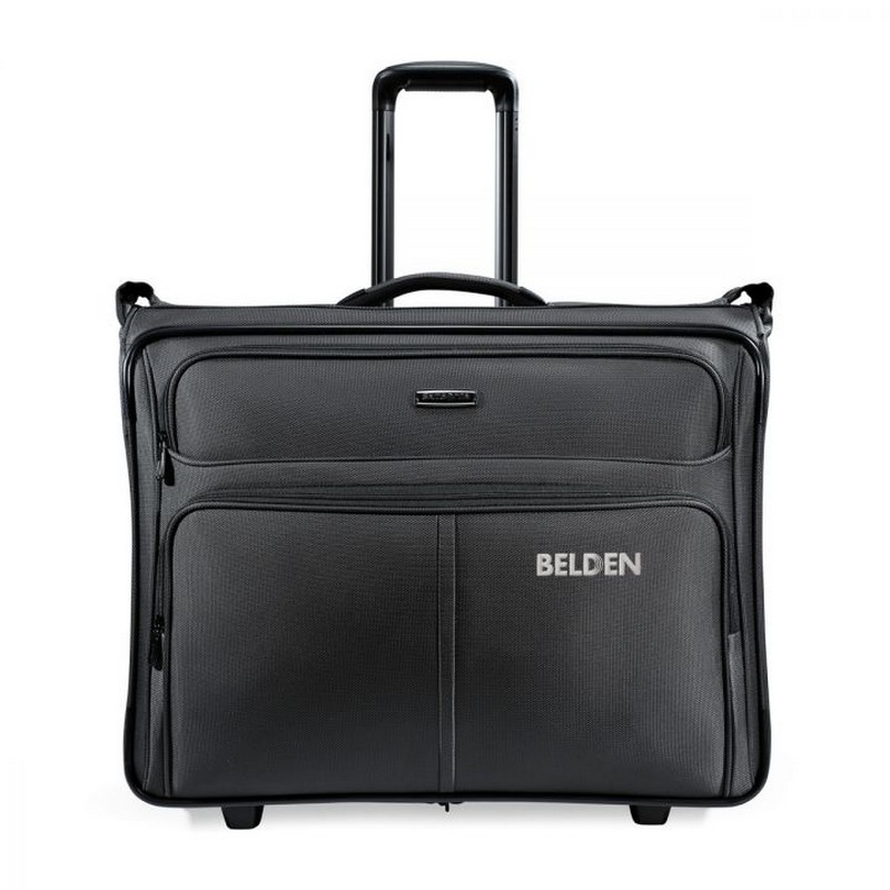 Leverage LTE takes functional and thoughtful design to a higher level. Constructed of durable nylon that is exceptionally resistant to abrasions, punctures, and tears. Smooth-rolling inline skate wheels for effortless mobility. Hanger-hook bracket allows for clothes to be moved from closet to garment bag. Two mesh corner pockets for small personal items. Removable closet hook to hang the bag from a door or closet bar. Interior includes pockets for shoes, extender panel for longer garments, mesh pockets, and tie down straps to secure loose items. Padded top handle provides comfort when lifting a fully-packed case. Ergonomic push-button locking handle design fits comfortably in your hand. Self-mending coil zippers for flawless closure. Two front pockets for easy access to travel necessities. Matte black hardware finish. Weight: 11.8 lbs..