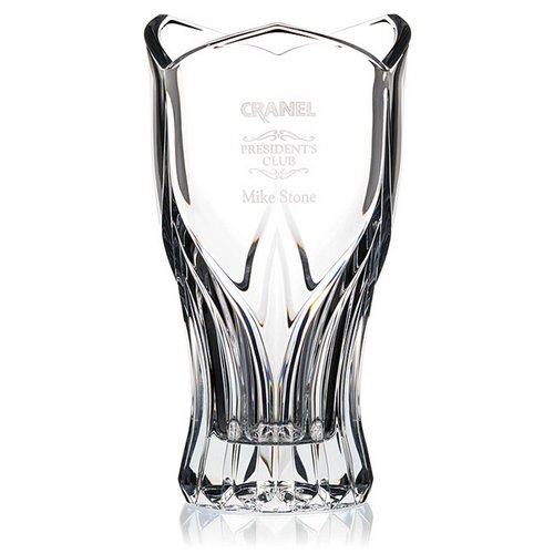 This artfully styled vase is a very popular piece. Great for employee gifts and achievement recognition Matching bowl available; see item 35632 Matching vases available, see items 35627, 35628 and 35742 Material:24% lead crystal Decoration Type:Deep Etch Dimensions:6" dia. x 10-3/4"h Max Imprint Area:Front (Standard): 2-1/2"w x 2-1/2"h|Right Panel (O Ship Wt:7 lbs.